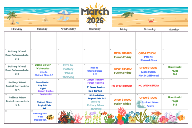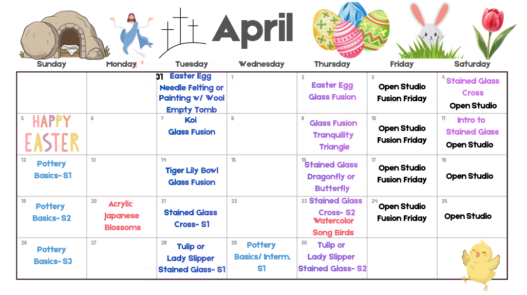 We provide group and 1:1 classes in our pottery and glass studios. We offer a variety of other visual arts classes from needle felting and macramé to drawing and painting fundamentals. You can find the scheduled classes on the Classes + Workshops page.