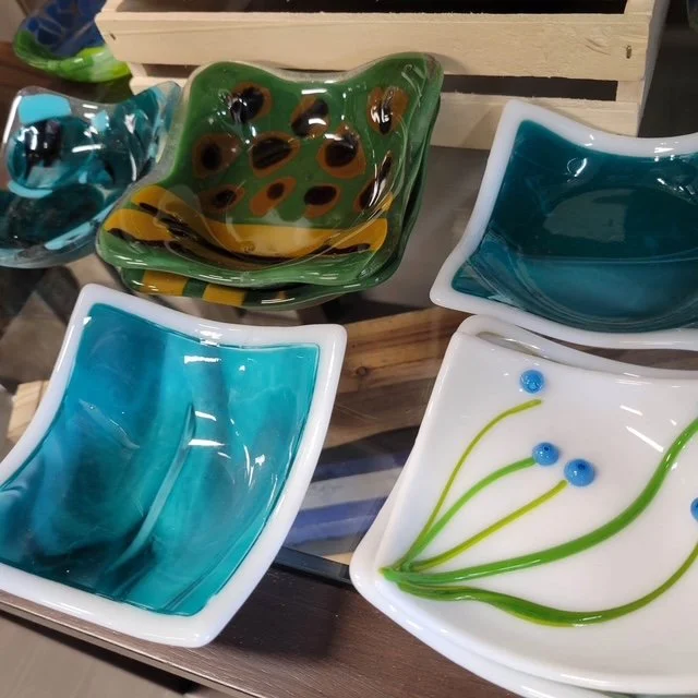 Glass fusion is a beginner friendly art form using many forms and colors of glass with endless possibilities. Select from any of these styles. Allow us to slump your design into a bowl shape or a candle dish for an additional $8 Kiln firing.